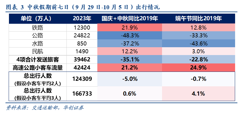 量的修复程度有所回落。一是国内旅游人次,中秋、国庆旅游人次为2019年同期的104.1%,低于五一、端午的119.09%、112.80%。二是国内出行人数,我们预计假期前七日客流总量较2019年增长-5%至0.6%,端午节在-0.7%至4.1%,五一前三日为5%至6%。