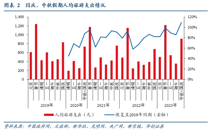 价有所修复,并首次超过疫情前水平。我们用旅游收入除以出游人次得到人均旅游支出,此次中秋、国庆人均旅游支出为912元,恢复至2019年国庆假期的109.8%。人均旅游支出为2020年主要节假日以来(见图表2),首次超过疫情前水平。此前五一、端午假期,人均旅游支出分别为2019年同期的90%、86%。