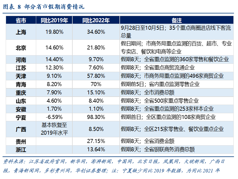 上海、北京、河南、江苏、天津等省份,假期零售等数据较2019年增速较快。