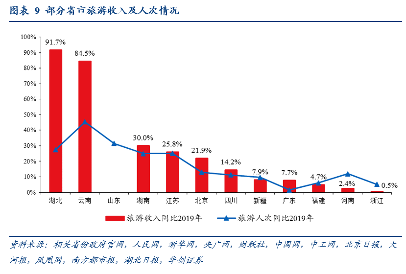 湖北、云南、山东、湖南、江苏、北京、四川等省份,假期旅游数据增速较高。我们统计了12个主要省市的旅游接待人数和收入情况,其中湖北、云南、湖南、江苏、北京、四川6省,旅游收入较2019年均实现双位数增长,且旅游收入修复程度均高于旅游人次修复程度。山东未公布旅游收入情况,但假期全省14家5A级旅游景区日均接待游客数,较2019年实现31.5%的高增。