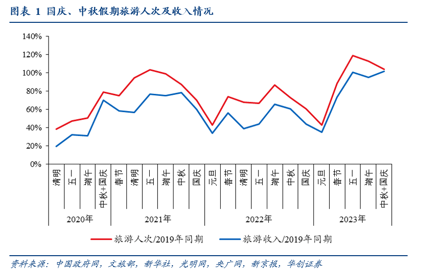 据文化和旅游部数据中心数据,中秋、国庆假期8天,全国国内旅游出游8.26亿人次,按可比口径恢复至2019年同期的104.1%;实现国内旅游收入7534.3亿元,按可比口径较2019年增长1.5%。我们进一步拆分量价,并与前期作对比。