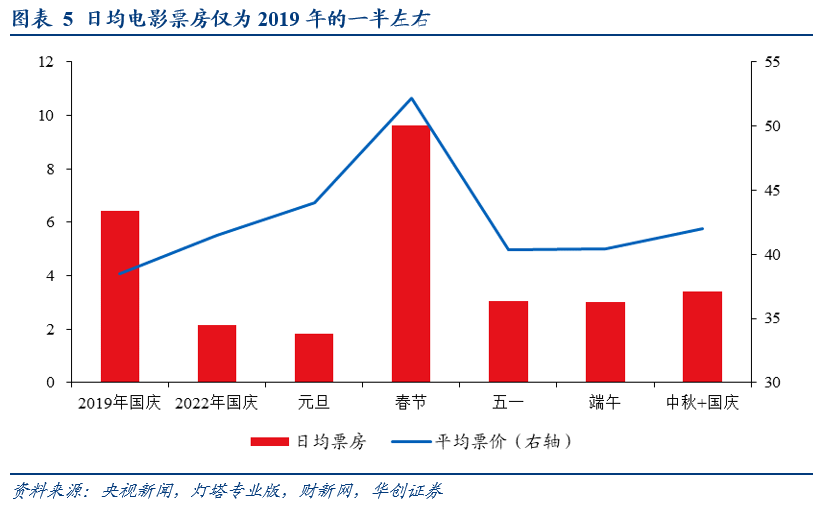 电影票房:表现平平。截至10月6日21时,国庆档(9月29日-10月6日))总票房为27.23亿元,2019-2021年国庆票房体量均在40亿元左右。电影票房平淡的原因可能包括,暑期档透支、出游及体育赛事对观影热度的分散等等。