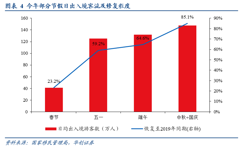 一是国家移民管理局公布的日均出入境旅客数,恢复至2019年国庆假期的85%左右,此前五一、端午假期分别为59.2%、64.6%。