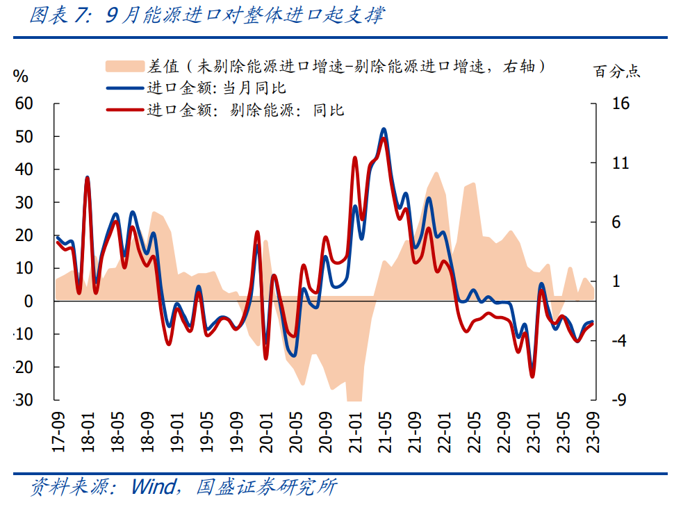 >能源进口仍是重要支撑。9月我国成品油、煤、原油、天然气进口分别同比66.4%、0.6%、0%、-33.8%,剔除能源后我国进口增速为-6.9%。