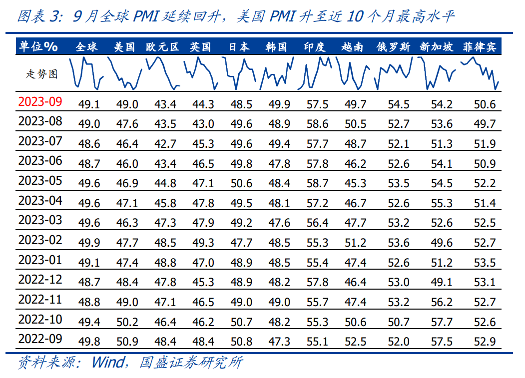 1、整体看,9月出口同比-6.2%,强于Wind一致预期-7.6%和前值-8.8%,为连续2个月降幅收窄;环比增5.0%,创2010年以来同期最高水平,指向9月出口韧性仍偏强。归因看,基数回落之外,外需韧性应是主要支撑。具体看:9月全球制造业PMI续升0.1个百分点至49.1%,美国、欧盟、英国等主要经济体PMI韧性偏强,其中:美国ISM制造业PMI回升1.4个百分点至49.0%,创近10个月新高;欧盟PMI微降0.1个百分点至43.4%、但相对7月的42.7%也有所改善。而且,同中国出口结构类似的韩国、越南9月出口均有所回升,其中:韩国出口同比降幅收窄3.9个百分点至-4.4%,越南出口增速回升7.9个百分点至4.9%,指向外需可能存在边际改善。此外,2022年同期基数回落,也是9月出口同比降幅收窄的重要支撑。