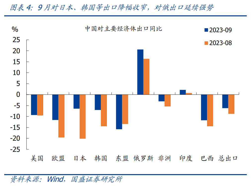 >分国别看,9月我国对东亚(韩国、日本等)、俄罗斯出口偏强,对欧美出口同比降幅收窄、但未超出基数影响范畴。
