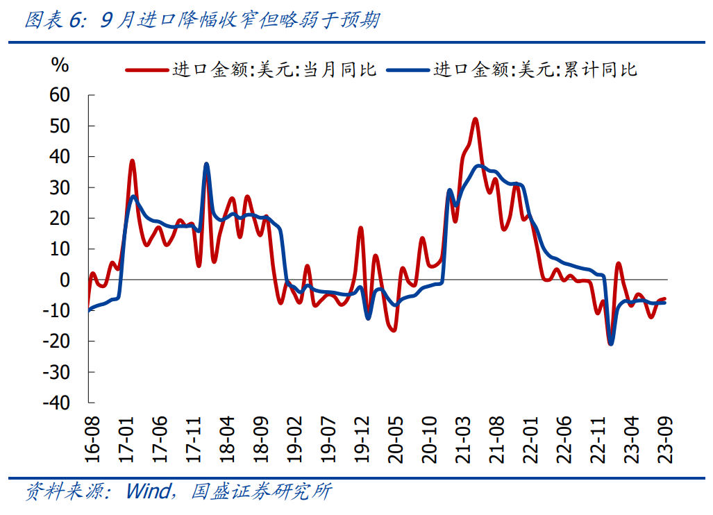 4、进口看,9月同比-6.2%,弱于预期-5.7%、但强于前值-7.3%,同样为连续2月降幅收窄;环比增2.3%,弱于季节规律(2015-2019年均值为3.9%),指向我国经济环比有所企稳、但经济内生动能仍待提升。