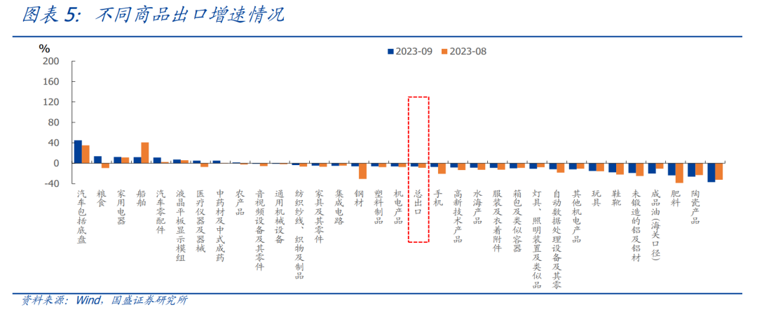 >分商品看,机电产品出口降幅收窄,汽车仍是亮点,消费电子相关产品拖累弱化;劳动密集型产品出口降幅同样有所收窄,主因基数回落。具体看:1)机电产品,基数回升背景下,9月机电产品出口同比降幅仍1.2个百分点至-6.1%,指向机电产品出口可能存在边际改善。其中:汽车出口延续强势,同比增45.1%,拉动整体出口约0.9个百分点;手机、电脑出口降幅分别收窄13.4、6.6个百分点至-7.1%、-11.6%,可能跟部分品牌电子产品发布新品等有关,二者合计少拖累出口约0.6个百分点。2)劳动密集型产品,由于基数回落,9月服装、鞋靴、纺织、家具、玩具出口降幅分别收窄3.6、4.4、2.8、2.1、0.5个百分点至-8.9%、-17.6%、-3.6%、-4.7%、-15.0%,合计少拖累整体出口约0.6个百分点。
