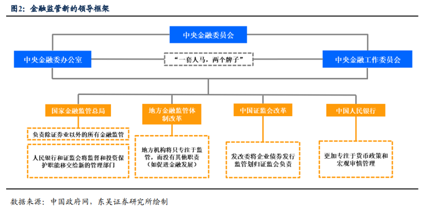 金融改革:对“改革”的提及似乎变少了,但党的领导变多了。今年金融改革的“主旋律”是以党和国家机构改革为抓手、加强党中央的领导,在此基础上打造以中央金融委员会为核心、自上而下的金融监管框架(图2)。此次金融工作会议强调“切实加强金融系统党的建设”,在党的领导下再推进股票发行注册制、政策性金融机构职能、国有金融资本管理等方面的改革。