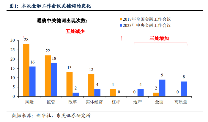 今年的中央金融工作会议“重点”在风险,但远远不只是风险。纵观通稿,本次会议的定调很高——“以加快建设金融强国为目标”,这在此前同规格的金融会议中从未出现过,而从关键词上看,之前备受市场关注的“风险”、“监管”、“改革”的着墨较2017年更少,而通篇甚至没有出现“杠杆”一词(图1)。要建设金融强国,防风险固然很重要(“以全面加强监管、防范化解风险为重点”),但光靠防风险是远远不够的。我们认为解读本次会议要注意两个维度的内容——发展和风险,中期目标和短期任务。