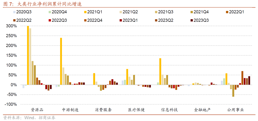 大类行业盈利表现和我们在此前业绩预告中分析基本一致,前三季度绝对增速强弱来看,公用事业>中游制造>消费服务>金融地产>TMT >医药>资源品。