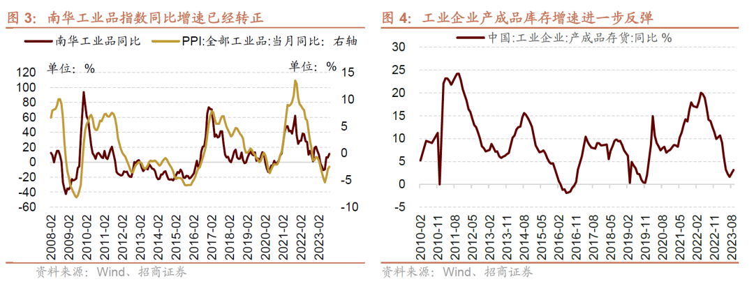 后续来看,在价格回暖、补库需求临近的背景下,A股业绩有望逐季改善。四季度由于政府债券发行提速,地产政策明显转暖,商品期货价格明显反弹,目前南华工业品指数同比增速已经转正。大宗商品价格对PPI有一定领先作用,因此,在去年9月PPI负值收窄的背景下,有望进一步负值收窄。价格回暖,需求回暖的背景下,企业补库存需求成为支撑未来需求和业绩增速的重要来源。