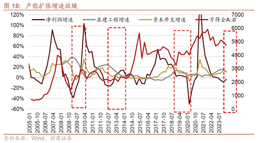 从历史数据来看,wind全A有较好表现往往伴随着全A盈利增速的上行期,产能扩张高点一般出现利润增速高点之后,因此产扩张的初期万得全A往往表现相对一般;而在产能周期的后半段一般对应着新一轮盈利周期的开始,万得全A也开始有较好表现。当前产能扩张增速在上半年达到高点,后续基本进入下半场,也对应着新一轮盈利周期的开始。
