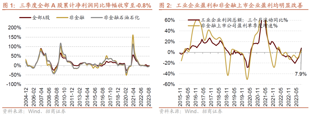 我们在此前中报业绩分析中明确指出中报A股业绩盈利底部已现,后续有望迎来新一轮业绩改善期。8月份以来工业企业盈利单季度增速转正,9月份延续两位数增长,再次确认盈利改善趋势。从日前披露的三季报业绩来看,A股盈利如期改善。根据一致可比口径和整体法测算,全A/非金融/非金融石油石化单季度净利润增速均同比由负转正。整体A股2023Q3/2023H1/2023Q1累计净利润同比增速分别为-0.8%/-2.9%/2.3%,对应单季度净利润同比增速为1.6%/-7.4%/2.3%。非金融石油石化2023Q3/2023H1/2023Q1净利润累计同比增速为-4.2%/-8.7%/-6.0%,对应单季度净利润同比增速为2.2%/-10.8%/-6.0%。