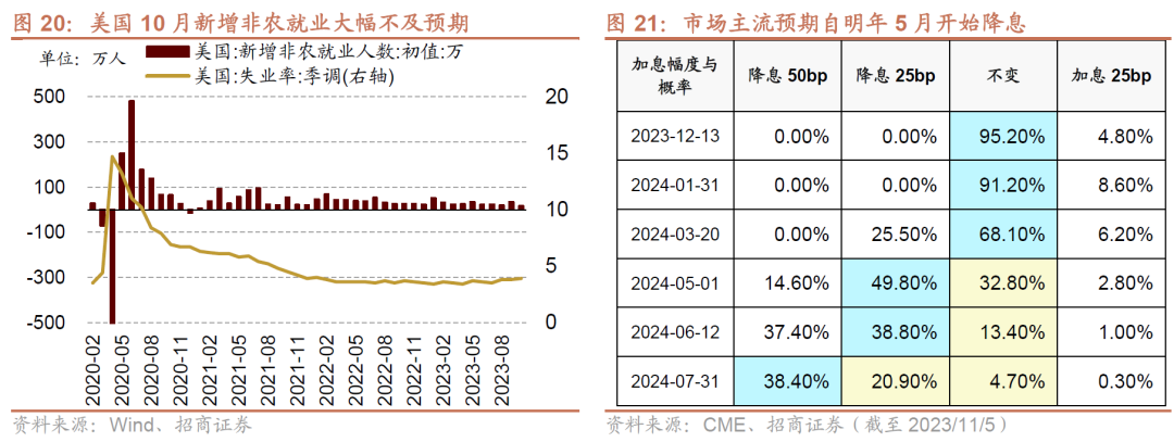 美国10月非农就业数据大幅降温,市场对美联储降息预期提前至2024年5月。11月3日,美国劳工统计局公布数据显示,美国10月非农就业人口增加15万人,低于市场普遍预期的18万人,9月的新增就业人数由33.6万人下修至29.7万人。美国10月失业率升至3.9%超过预期值3.8%,较9月的3.8%反弹,创2022年1月以来最高水平。目前12月不加息预期为95.20%,市场对于美联储明年首次降息预期从此前的6月提前至5月。