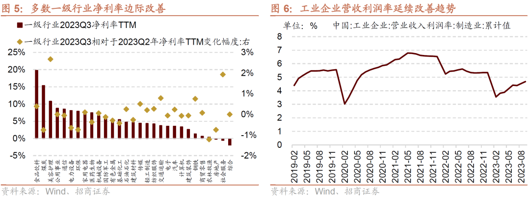 三季报来看,整体A股毛利率、净利率均边际改善。2023Q3非金融石油石化销售净利率TTM略有上升至5.13%,毛利率边际回暖。行业层面净利率改善较多的行业主要集中在中下游行业如,社会服务、交通运输、传媒、食品饮料、纺织服饰、汽车等。