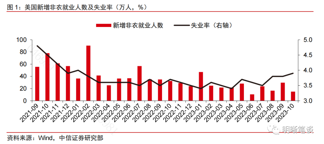 10月美国新增非农就业人数低于预期,失业率上升至3.9%。美国就业市场走弱态势逐渐明晰,薪资压力缓解,美联储年内加息概率较小。回顾历史,美债利率见顶后,美股往往会因后续美国经济恶化而承压,而对于国内而言,美债利率下行会缓解中国股市压力,也会增加国内货币政策宽松空间。但我国债券利率走势主要由国内经济主导。