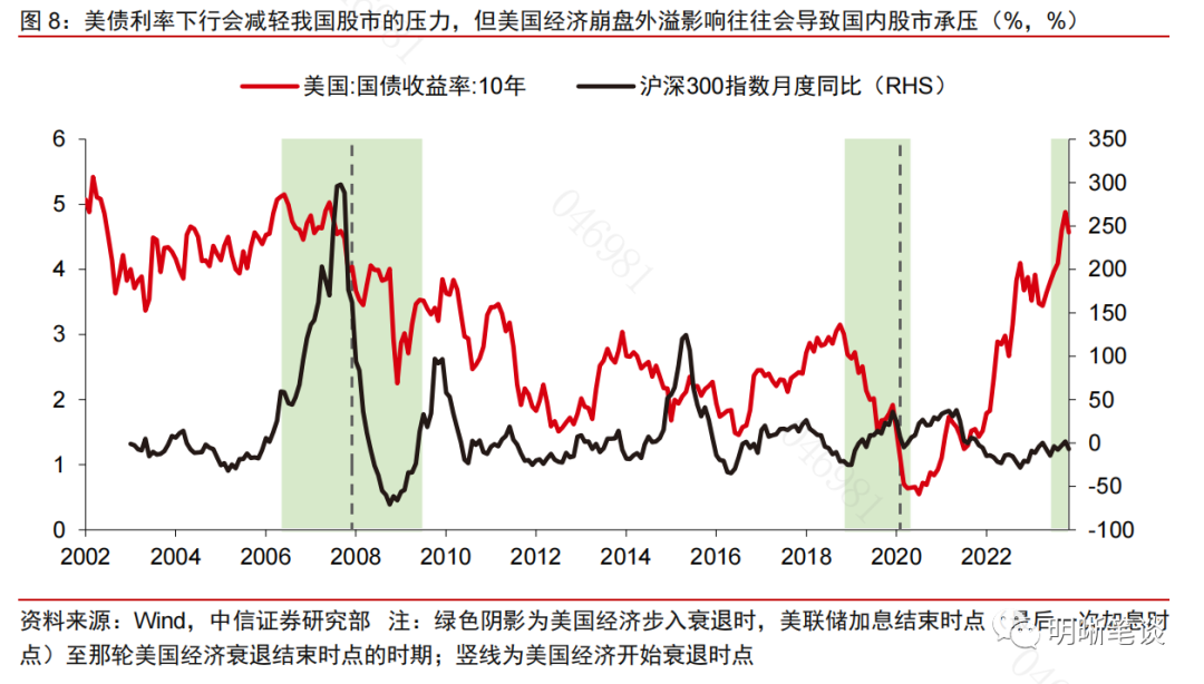 美债利率偏弱运行会减弱国内股市的外部压力,但若美国经济崩盘,我国经济往往会受到美国经济的外溢影响,进而导致国内股市有所承压。例如,2005年股权分置改革推动了中国资本市场的健康发展、吸引资金流入,同年人民币汇改提高了人民币国际地位和信誉度,进一步吸引外资。同时,我国经济2005年-2007年保持近两位数的增长,叠加美债利率下行减轻我国股市外部因素的负面影响。因而在美国经济衰退前,美债利率从高点回落偏弱运行时,我国股市大幅上涨。然而,美国经济衰退随后演变为全球金融危机,美国金融危机对我国经济也存在冲击,因而当时即便美债利率大幅下行,我国股市表现仍面临较大压力。
