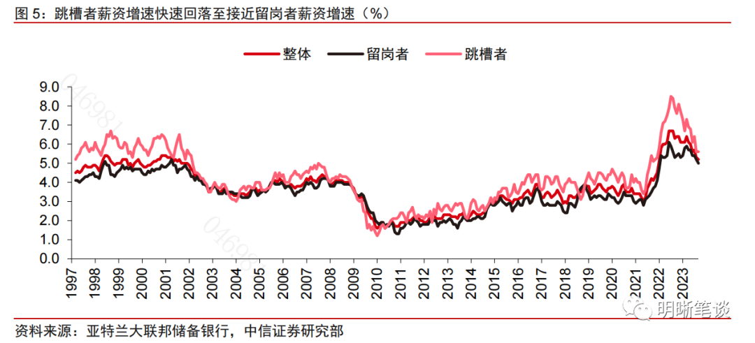 当前美国劳动力市场紧张有所缓解,薪资压力减少。10月非农薪资增速环比进一步下降,同比增速保持趋势性下降。单位劳动力成本三季度环比负增长,同比增速快速下行至1.9%,为2021年二季度以来最小增幅。同时,跳槽者薪资增速快速回落至接近留岗者薪资增速,非农离职率也在不断下降,反映出劳动力市场紧张局势有所缓解。此外,第三季度工人生产率增长达到三年来最快速度,有望进一步减轻薪资压力。
