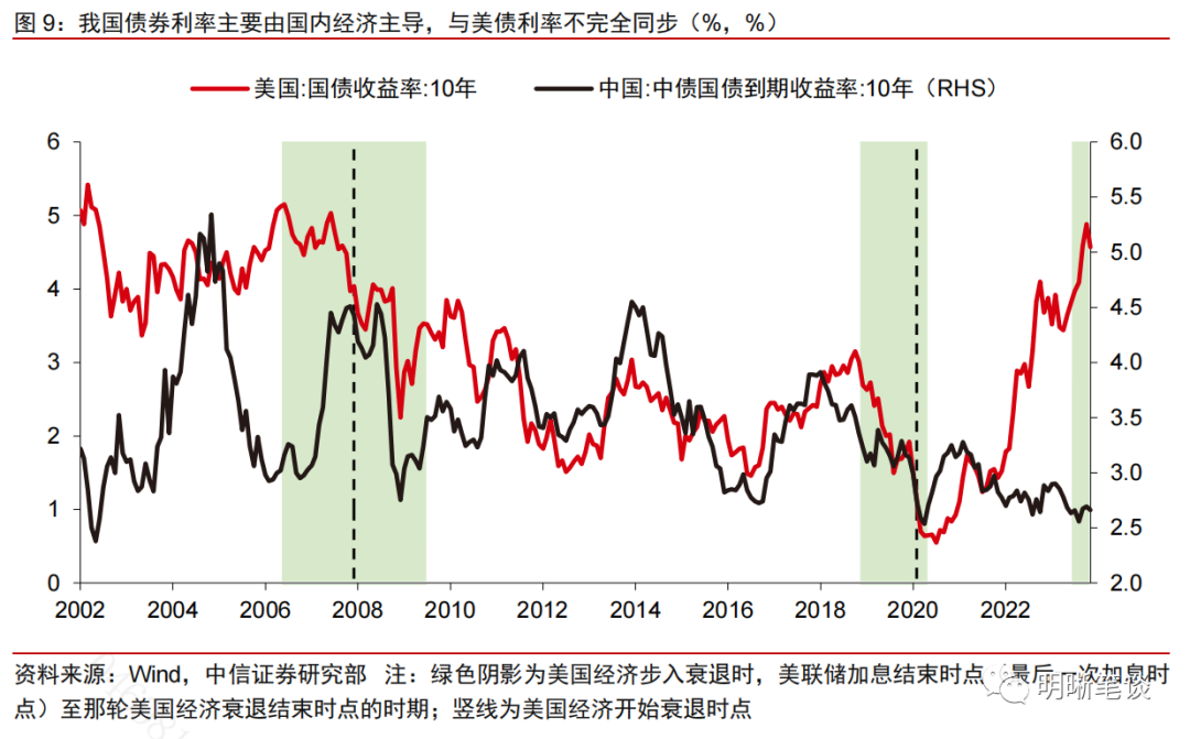 美债利率偏弱运行会减弱国内股市与债市的外部压力。美债利率下行往往会减轻我国股市的压力,但若美国经济崩盘,我国经济往往会受到美国经济的外溢影响,进而导致国内股市承受压力。美债利率下行为国内货币政策宽松提供空间,但我国债券利率走势主要由国内经济与货币政策主导。从历史经验来看,美债利率下行期间,我国债券利率会跟随经济形势和国内货币政策有所调整,与美债利率不完全同步。