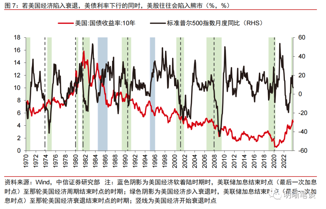 美债利率见顶时点往往在美联储停止加息时点附近,而美债利率见顶后美股走势与美国经济是否硬着陆密切相关。美联储加息停止时点往往与美债利率见顶时点相近,而在美联储加息停止(最后一次加息时点)至衰退结束(或经济周期结束)时期,美债利率往往趋势性大幅下行。若在加息结束后,美国经济能够实现软着陆,美债与美股往往会出现双牛走势。但若利率高位导致美国经济步入衰退,美债利率下行的同时由于经济下行压力,美股往往会陷入熊市,但在经济衰退结束时点附近,股市往往开始反弹。
