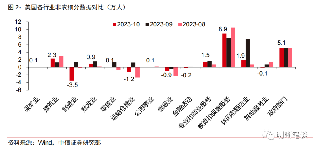 细分来看,10月美国非农就业人数的增长主要由教育和保健服务、政府部门、建筑业、休闲和酒店业、专业和商业服务以及批发业的增长带动。10月美国非农就业人数总计新增15.0万人,明显低于过去12个月的平均增幅24.31万人。增长主要由教育和保健服务(+8.9万人)、政府部门(+5.1万人)、建筑业(+2.3万人)、休闲和酒店业(+1.9万人)、专业和商业服务(+1.5万人)、批发业(+0.9万人)推动。