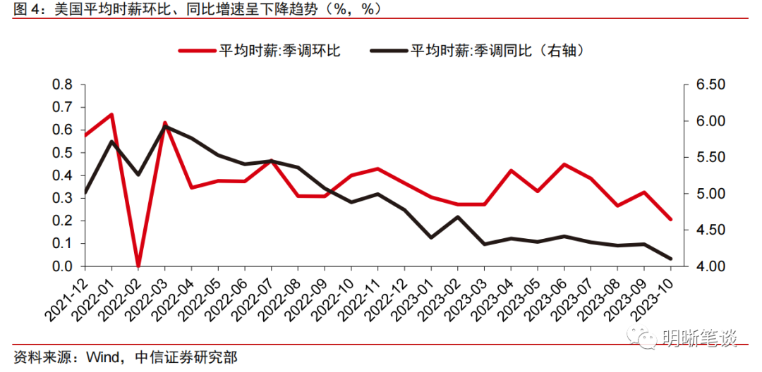 当前美国劳动力市场紧张有所缓解,薪资压力减小,美联储年内加息概率降低。虽然鲍威尔表示会关注近期显示经济韧性和劳动力需求的数据,这些可能会使通胀进一步下行面临风险。但10月非农薪资增速环比、同比保持趋势性下降,单位劳动力成本环比负增长,跳槽者薪资增速快速回落至接近留岗者薪资增速,非农离职率也在不断下降,当前就业市场增长已明显放缓,薪资压力较为可控。鲍威尔也认为名义工资增长已显示出一些放缓迹象,就业成本数据接近美联储预期。因而我们预计未来美联储进一步加息必要性较低,年内再度加息的概率较小。