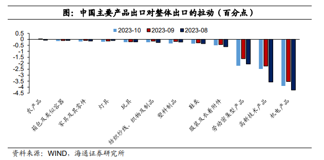 分产品来看,机电产品拖累较大。10月中国机电产品出口跌幅扩大至6.7%,对出口拖累3.9个百分点。高新技术产品和劳动密集型产品出口跌幅也有所扩大,对出口拖累都超过2个百分点。进一步来看,农产品、箱包、家具以及灯具和玩具等表现尚好。