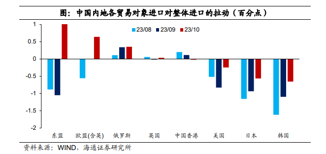 从国别来看,东盟和欧盟贡献较为明显。10月中国自东盟进口增速大幅转正至10.2%,较9月上升17.2个百分点,贡献进口增长1.5个百分点,是最主要的贡献。考虑到去年同期自东盟进口增速并不算特别低,10月这一表现或与内需政策不断推出以及“一带一路”10周年,中国加强与东盟贸易联系有关。后续表现仍需进一步跟踪。