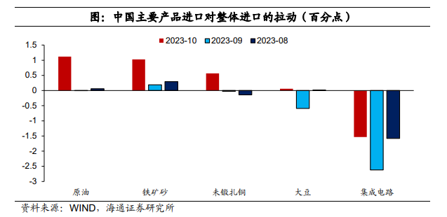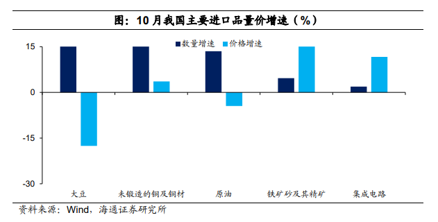 从量价拆分来看,主要进口商品数量和价格表现较好,例如,10月大豆进口数量大幅转正至24.6%,很大程度上与去年同期低基数有关(2022年10月进口为-19.0%);未锻轧铜进口数量也大幅转正至23.7%,原油进口数量保持2位数增长,均对10月进口有较大提振作用。