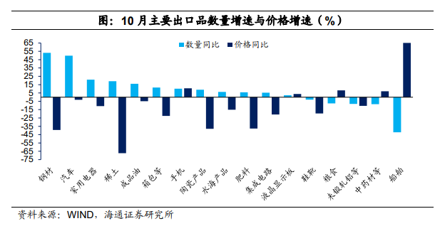 从量价拆分来看,多数产品出口数量增速为正,不过价格在持续拖累,多数产品出口价格增速为负,也是导致出口表现偏弱的原因。