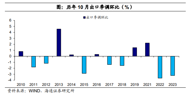 10月出口同比增速-6.4%,较9月小幅下滑0.2个百分点。从季调环比来看,10月出口季调环比为-3.2%,为过去10年同期跌幅相对较多的一月。