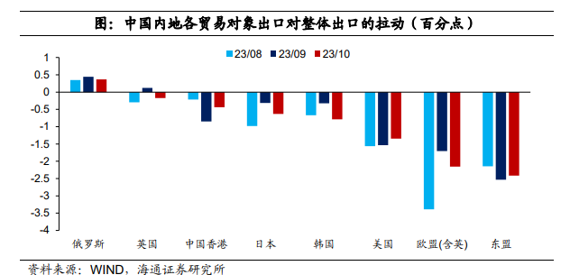 从国别来看,对出口拖累较为严重的仍是美国、欧盟和东盟等地区,而俄罗斯是重要贡献来源。10月中国对东盟出口增速下跌15.1%,拖累出口2.4个百分点,是10月拖累最严重的经济体。这很大程度上或与去年同期基数较高有关,例如,去年10月中国对东盟出口增速为20.3%。如果剔除基数影响,10月中国对东盟出口增速为1.5%。