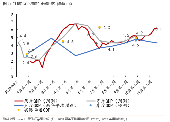 在9月GDP两年平均增速上行至4.8%后,经济环比动能再度走弱,10-11月我们估算两年平均增速在4.5%和4.3%左右。