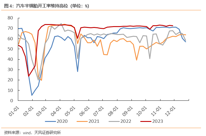 11月1-26日,乘联会数据显示乘用车零售138.9万辆,同比去年同期增长17%,其中新能源车同比增长33%。需求韧性也带动汽车生产维持高景气,11月第四周,汽车半钢胎开工率依旧维持在72.6%左右,高于过去几年同期水平。