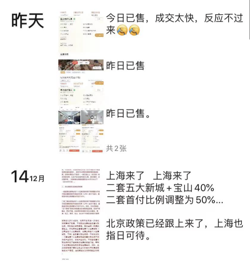 二手房方面,“今日已售,成交太快,反应不过来。”12月18日,上海中原地产某门店店长姜平在朋友圈里发布了一条成交信息,并写下了自己的感受。