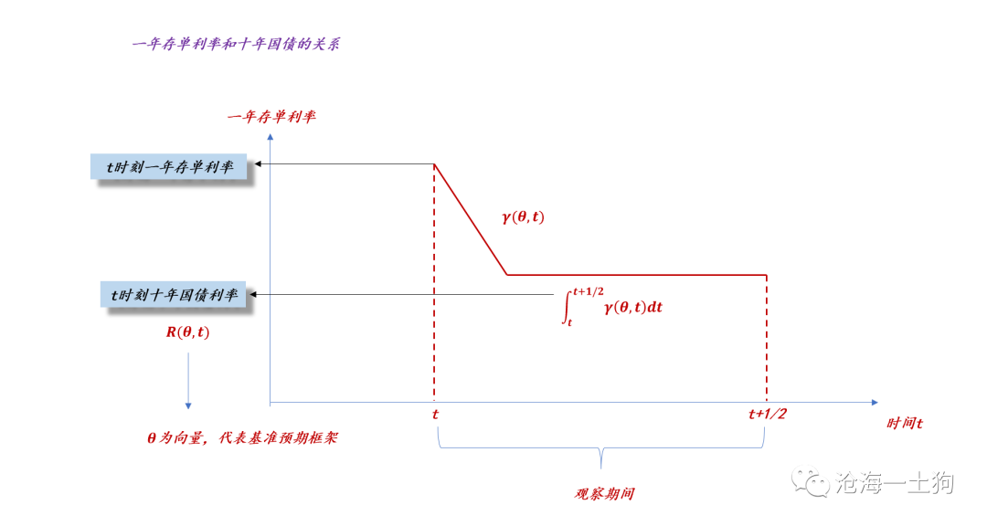 如上图所示,我们可以这样一种方式(ps:这不是唯一方式)定价十年国债利率:在未来半年内,对一年存单利率预期路径作积分——求平均值也是一种积分(ps:为了简单起见,我们先不讨论参数的设置,譬如,为什么是半年之类的)。