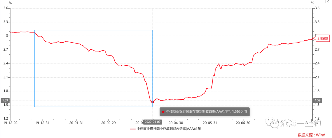 这一轮极其特殊,一年存单利率从高位的3.10%,下降至低位的1.60%, 下降了150bp。真正维持1.60%低利率的时间大概只有2-3个月。