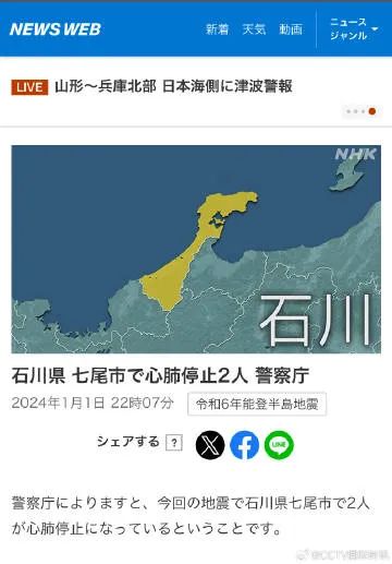 据日本广播协会(NHK)援引日本警察厅消息报道,本次能登强震已造成石川县七尾市2人“心肺功能停止”。