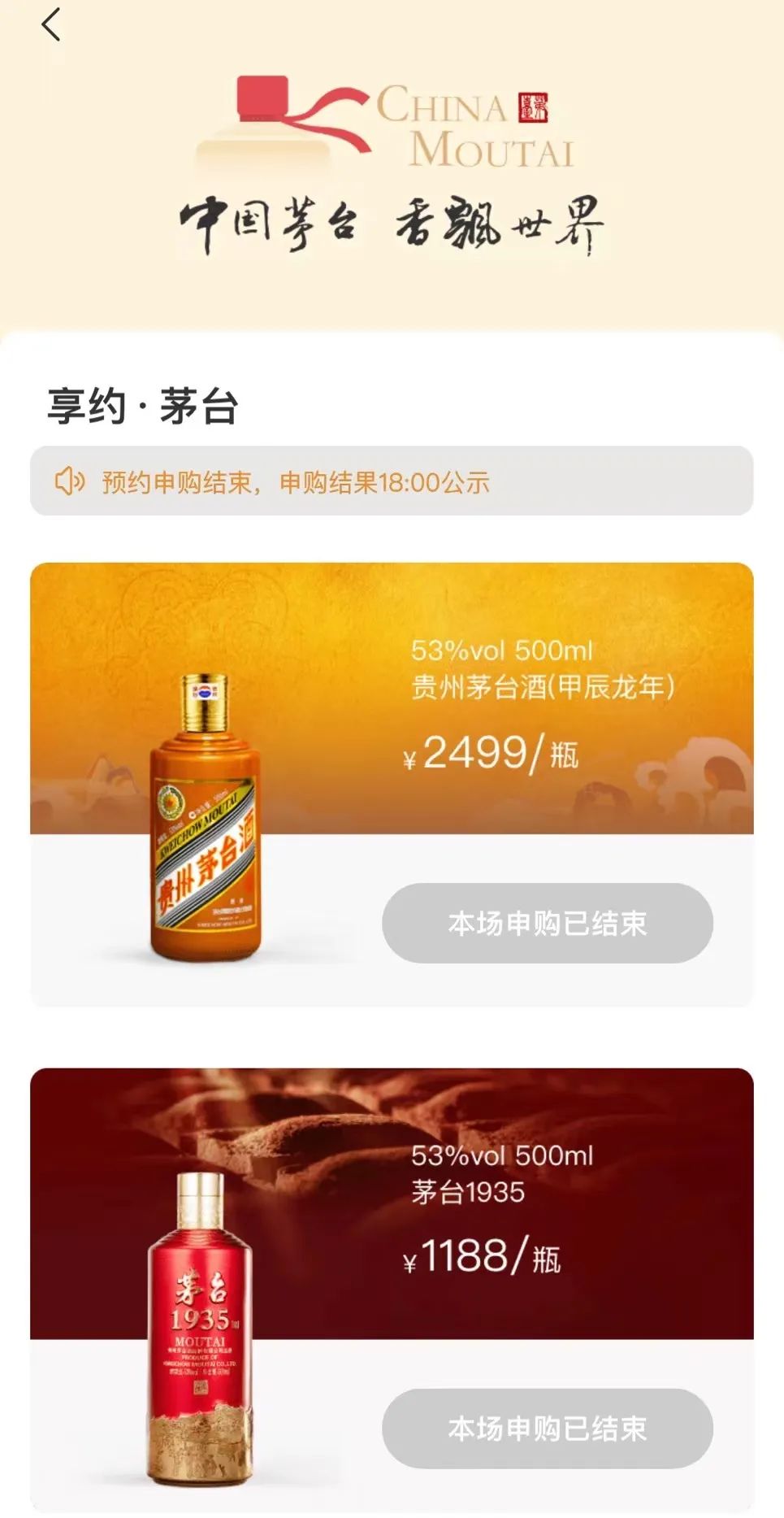 “龙茅”于7日正式在i茅台APP上开售,申购时间为9:00-10:00,其中53%vol 500ml“龙茅”,官方指导价为2499元/瓶;53%vol375ml“龙茅”,官方指导价为3599元/盒(两瓶)。