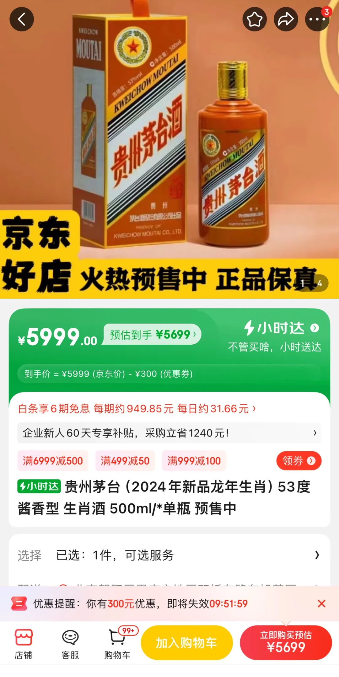 8日,中新经纬在另一电商平台上看到,一家名酒专营店正在预售“龙茅”,预估到手价5699元。