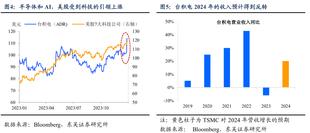 AI+半导体,为短期内股市上涨造势。科技主题从事件到情绪有力地刺激了美股的上涨。事件方面,1月19日苹果Vision Pro发布、Meta全球商业部门负责人在世界经济论坛上表示,在AI的帮助下,广告回报率平均提升32%;情绪方面,台积电对2024年整体复苏指引乐观,上调对AI的预期、谷歌云宣布将与AI模型赋能三星手机、Meta上调英伟达算力卡的资本开支等。靠着AI行情的全面提振和刺激,美国股市在“FANNG+”(美股科技7“姐妹”)的引领下大涨(图4-5)。