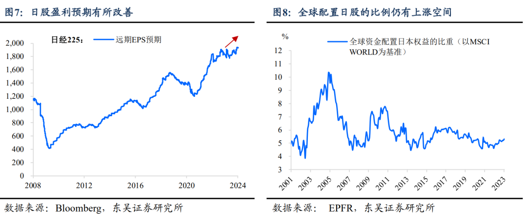 经济基本面+企业盈利预期改善。日本由通缩走向再通胀,但考虑到日本央行放弃负利率、调整YCC的概率较低,1月市场的转向预期淡化,从而带领日元走贬引领日股上涨。加之日企改革初见成效带来的盈利预期改善,在当前全球资金配置日本股市的比重仍旧较低的情况下,外资进一步增配,同时带领内资的入市,携手创造了日股亮眼的表现(图7-8)。