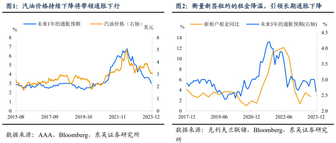 美股方面,经济的韧性为美股上涨创造了基本的客观条件。1月初以来,就业和零售销售的超预期,良好的宏观经济环境帮助市场验证衰退的风险的下降。叠加汽油价格回落及新签租约租金的大幅降温,长短期通胀预期稳步下降(图1-2)。对于越来越浓的“去通胀”降息预期,得到了进一步的确认。