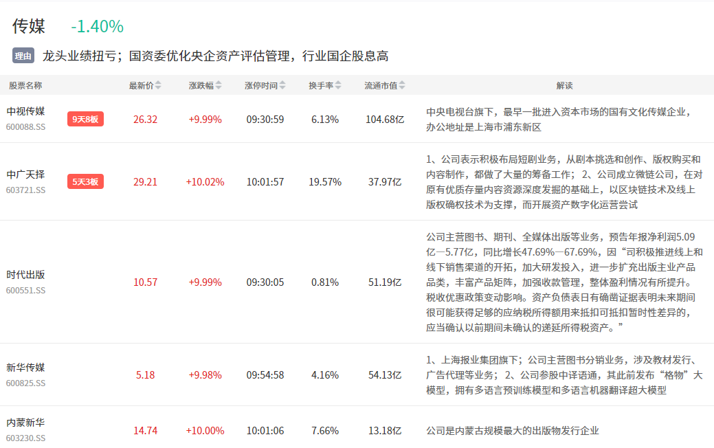 传媒板块今日表现主动,在中视传媒7连板刺激下,其传媒属性扩散。各地国资委传媒股表现,比如上海国资的新华传媒、内蒙古的内蒙新华、湖南国资的中广天择。