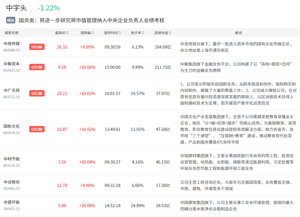 中字头依然是资金交易重心,中视传媒7板之外,中粮资本、中材节能、中设股份等多股涨停。