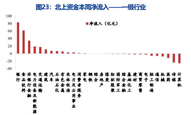 与上周一样,北上资金本周净流入的行业前三甲依旧为银行、食品饮料和非银金融,金额分别为83.48亿元、61.75亿元和34.6亿元。流出最多的一级行业为计算机 (-25.57亿元)、传媒(-23.63亿元)、医药(-11.74亿元)。
