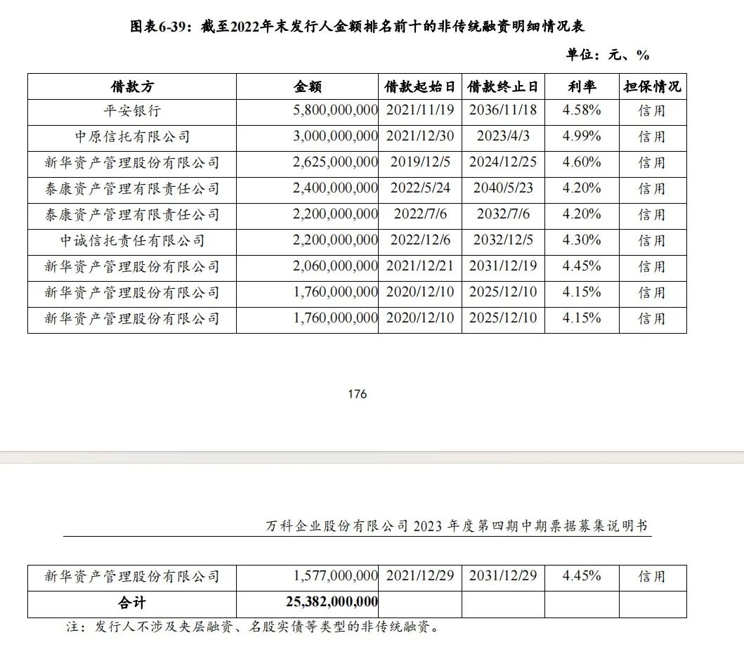 另据万科企业股份有限公司2023年度第四期中期票据募集说明书显示,截至2022年末,在万科发行人金额排名前十的非传统融资明细情况表中,主要借款方之一就有新华资产,其合计借款金额约97.82亿元,借款终止日最早一笔到期的是2024年12月25日。