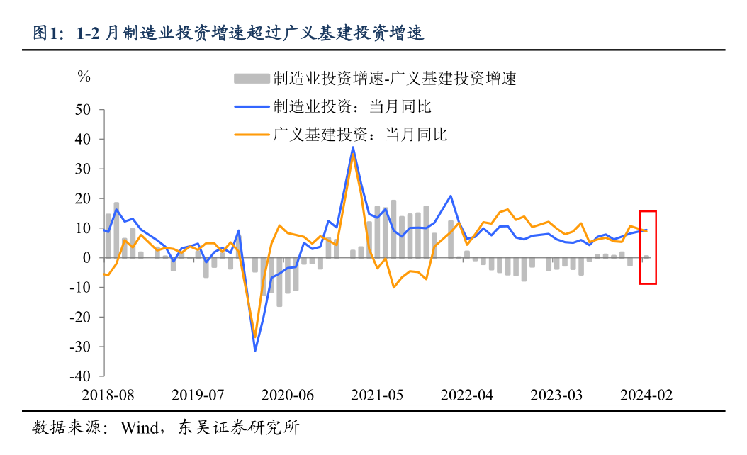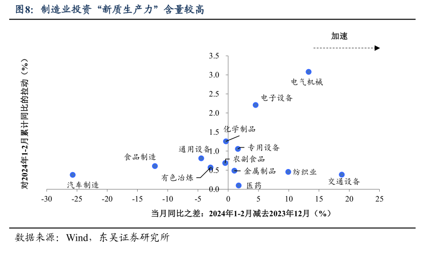 制造业:“新质生产力”含量较高。2024年1-2月制造业投资增速录得9.4%,为近15个月以来的最高增速,这与制造业PMI传递出来的信号似乎有所背离。是什么因素导致了开年制造业投资的“背道而驰”?我们认为促使制造业投资增速上升的核心因素在于“新质生产力”的发展。
