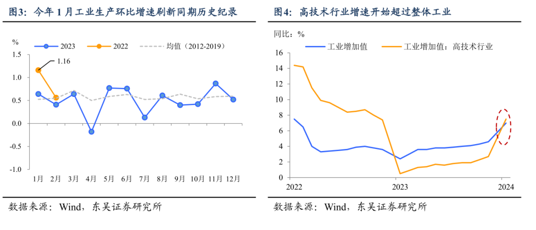 工业:史上最“快”1月生产,靠什么?今年1月工业生产环比增速达1.16%,为同期历史最快(尽管1月制造业PMI生产指数只有51.3%)。有三点值得注意,第一,从细项上看,今年1至2月同比增速与去年同期以及去年12月相比,“新质生产力”的典型代表计算机、通讯和电子设备行业是重要的拉动,经过2023年,高技术行业的增速开始超过整体工业增长。